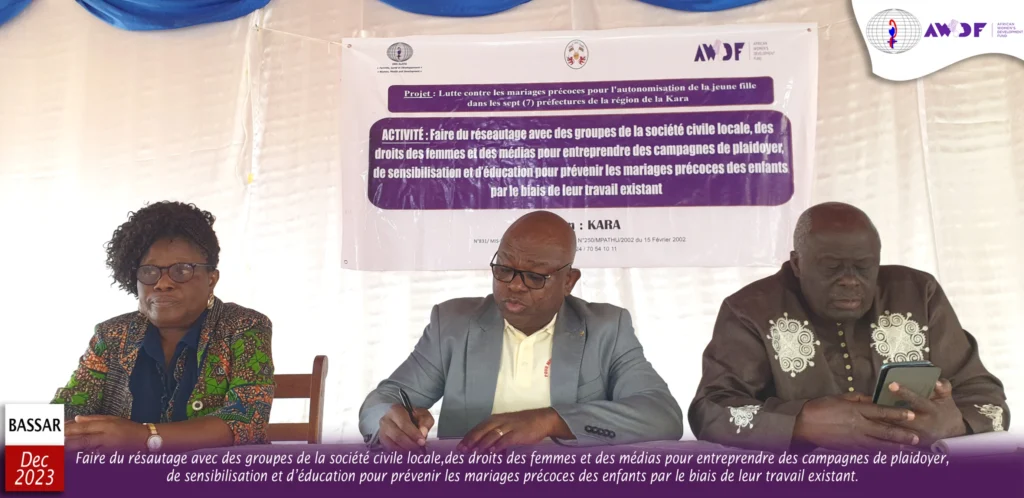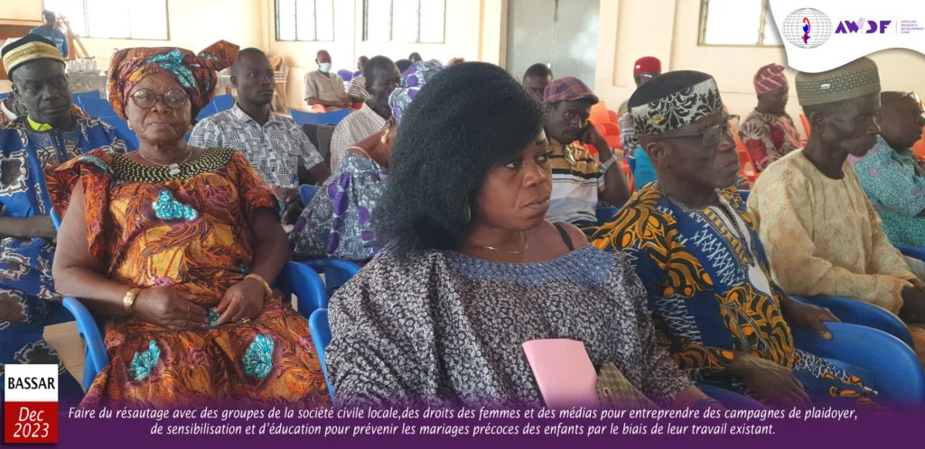 La lutte contre les mariages précoces et forcés pour l’autonomisation de la jeune fille dans les sept préfectures de la région de la Kara, est un projet financé par l’AWDF (African Women’s Development Fund) et piloté par l’ONG ALAFIA, avec la participation active de sa Directrice Exécutive. Ce partenariat entre l’AWDF et l’ONG ALAFIA démontre leur engagement commun envers la promotion des droits des femmes et des jeunes filles, ainsi que leur détermination à mettre fin aux pratiques néfastes telles que les mariages précoces et forcés.